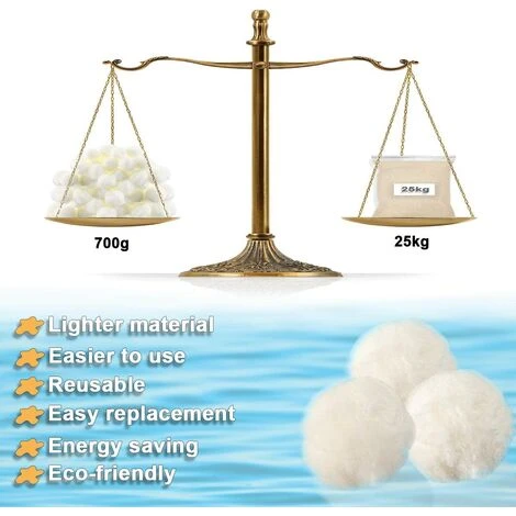 - Poids: 300g (bille filtrante 300g ~ 11 kg de sable filtrant), 500g (bille filtrante 500g ~ 18 kg sable filtrant), 700g (bille filtrante 700g ~ 25 kg de sable filtrant).