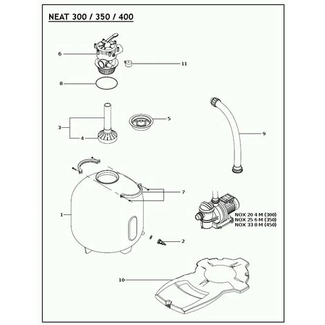 El filtro de arena consta de un tanque de polietileno monocasco. Tiene un colador de estrella (para el NEAT 550) o de diamante (para el NEAT 300, 350, 450). Tanto el vaciado como el llenado del filtro son fáciles gracias al orificio de drenaje situado en la parte inferior del filtro y al cono de llenado que se coloca en la parte superior del filtro.