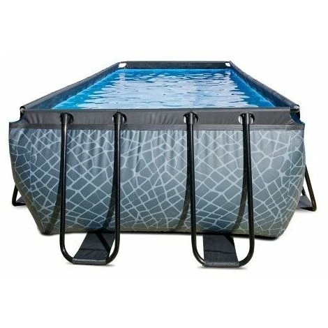 EXIT Stone zwembad 540x250x122cm met filterpomp – grijs Het EXIT Stone zwembad 540 x 250 x 122 cm is een rechthoekig grijskleurig frame zwembad. Dit grote zwembad is standaard voorzien van een filterpomp en een zwembadtrap, waarmee je veilig het zwembad in en uit kunt stappen. Het frame zwembad biedt genoeg ruimte om heerlijk op een luchtbed te dobberen. En wil je toch liever onder water zwemmen? Het EXIT Stone zwembad is maar liefst 122 centimeter diep waardoor je echt onder water kunt duiken. Met het hoogwaardige frame zwembad van EXIT Toys beleef je gegarandeerd de leukste wateravonturen in je eigen tuin! Een frisse duik in je zwembad! Het Stone zwembad heeft een modern en stoer steenpatroon op de zijkant en is daarmee een échte blikvanger in de tuin. Het EXIT zwembad is uitgevoerd met sterke 3-laags wanden van PVC en polyester en de binnenzijde van het zwembad is blauw voor het frisse zwembadgevoel. Het zwembad is geschikt voor maar liefst negen personen en omdat het zwembad diep is, kun je ook baantjes trekken en onder water duiken. De meegeleverde filterpomp houdt het water fris en in beweging zodat vervuiling van het water wordt tegengegaan. De filterpomp kan eenvoudig aan het zwembad worden gemonteerd en door middel van filtercartridges wordt het water ververst. Stabiel en sterk! Het frame zwembad is niet alleen uniek, maar ook stabiel en sterk. Het stalen zwarte frame van het zwembad is extra dik met een diameter van 50 mm en de frame-poten zorgen voor optimale stabiliteit, zodat het zwembad altijd stevig blijft staan. Natuurlijk is er ook aan duurzaamheid gedacht: het zwarte frame is gegalvaniseerd en gepoedercoat zodat roest geen kans maakt. Het Duplex Coating Systeem noemen we dat bij EXIT Toys. Tijd voor een frisse duik in je eigen EXIT zwembad in de tuin! Standaard inbegrepen – Zwart stalen zwembadframe 540 x 250 x 122 cm – Grijze liner met stoer steenpatroon – Inclusief filterpomp met cartridge- Inclusief trapje- Inclusief liner reparatieset – Handleiding framebad- Handleiding pomp – Handleiding ladder EXIT tip: voor extra reiniging wordt het gebruik van chloortabletten aanbevolen.