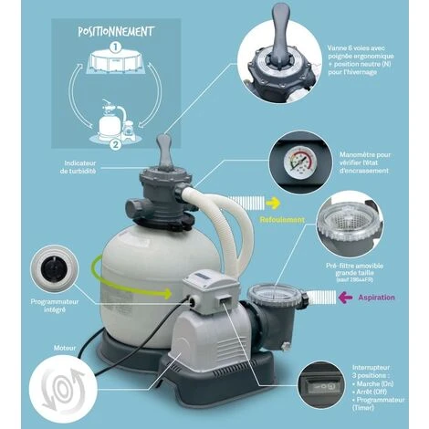 FILTRE À SABLE 28646FR.Débit – Puissance : 6 m³/h – 0,3CV.Capacité sable : 23 kg.Capacité verre filtrant : 16 kg.Granulométrie : 0,4 à 0,8 mm.Pour piscine jusqu’à 36 m3.Diamètre réservoir : 305 mm.Consommation : 250 W.