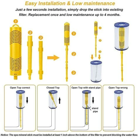 FACILE À UTILISER ET À REMPLACER Placez simplement les pièces de bâton minéral dans votre filtre de spa ou votre panier d’écumoire et laissez-les faire leur travail, aucun autre processus compliqué n’est nécessaire. 2 pièces pratiques à remplacer dans le temps. (Recommandé de le remplacer une fois tous les 3-4 mois.)