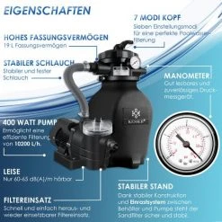 En vertu du sable comme milieu filtrant, ce filtre à sable de piscine est efficace pour filtrer et purifier l’eau de votre piscine. Il s’agit d’une option très économique et nécessitant peu d’entretien pour garder l’eau de votre piscine intacte. Fabriqué en polyéthylène haute densité, le filtre à sable est hautement durable. Ce filtre est conçu pour atteindre un débit de 7 m³/h. La pression de service maximale est de 3,5 bar. Pour démarrer l’opération, 19 kg de sable filtrant (non inclus) sont nécessaires. Le filtre est équipé d’une vanne multivoie à 4 positions : filtre (pour filtrer l’eau), contre-lavage (pour nettoyer le milieu filtrant), rinçage (pour rincer le système de filtration) et hiver (pour hiver). Remarque : Il peut être connecté avec des tuyaux de 32 mm et 38 mm de diamètre.