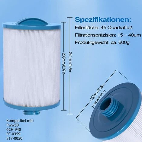 Taille: 150 * 200mm Système de purification d’ions Microban Silver Dessus: fermé, bas: fileté Le filtre doit être changé tous les 4-6 mois (selon l’utilisation). La boîte contient: 2 cartouches filtrantes