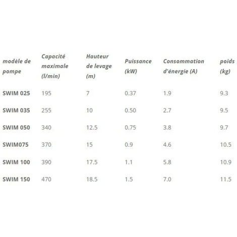 | modèle de pompe | Capacité maximale (l/min) | Hauteur de levage (m) | Puissance (kW) | Consommation d’énergie (A) | poids (kg) |