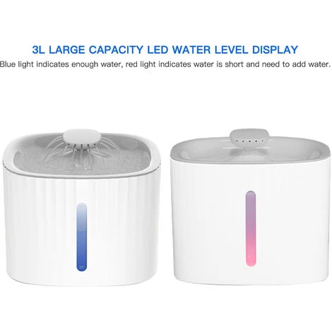 Affichage du niveau d’eau léger à LED, la lumière bleue indique que l’eau à l’intérieur est suffisante, la lumière rouge indique que l’eau est courte et qu’il faut ajouter de l’eau. La lumière LED peut également guider vos animaux de compagnie à boire de l’eau dans l’obscurité.